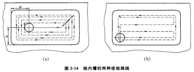 (2)*短的切削進(jìn)給路線 縮短切削進(jìn)給路線既可有效地提高生產(chǎn)率,又可降低刀具的磨損。在圖2-14a中采用環(huán)切法加工內(nèi)槽;而在圖2-14b中采用行切法加工內(nèi)槽。從兩圖中比較可以知道,圖2-14b的切削進(jìn)給路線明顯比圖2-14a的短。